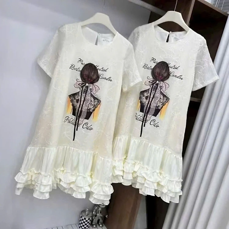 Váy Ren Tơ 2 Lớp In Cô Gái Phối Chân Thô Bèo Tầng Kèm Tag Nơ