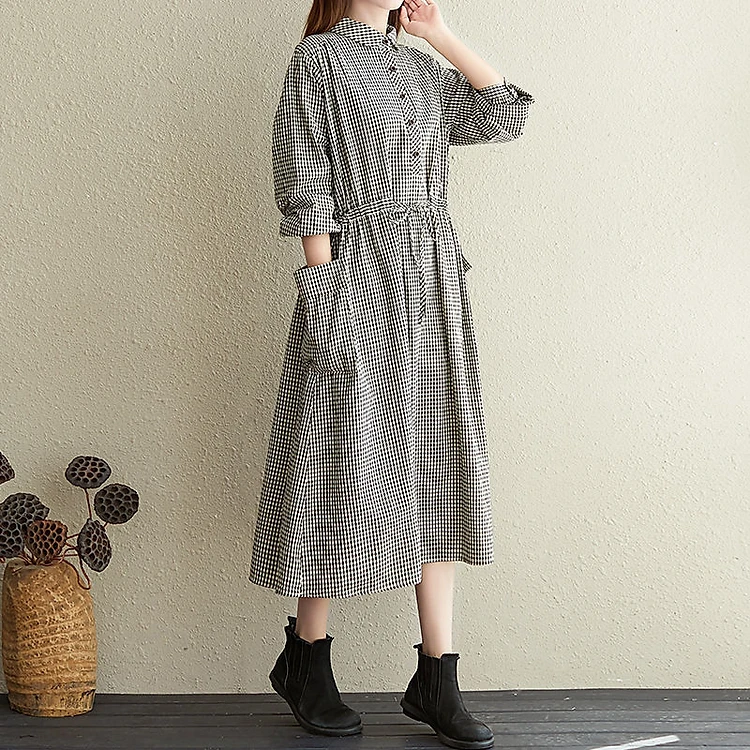 Váy sơ mi dáng dài thắt eo – Đầm nữ form suông vintage kẻ caro phong cách công sở Haint Boutique Da187