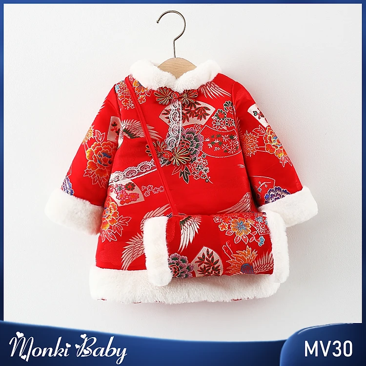 Đầm váy bé gái trần bông kèm túi đeo xinh, giữ ấm tốt cho bé ngày lạnh, hoạ tiết thêu nổi sang trọng tinh tế, viền lông trắng điệu đà | MV30