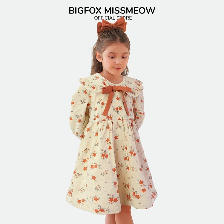 Váy thu đông cho bé gái Bigfox Miss Meow vải nhung hoa xinh xắn cổ bèo phối nơ tiểu thư size đại cho trẻ em gái 3-11 tuổi