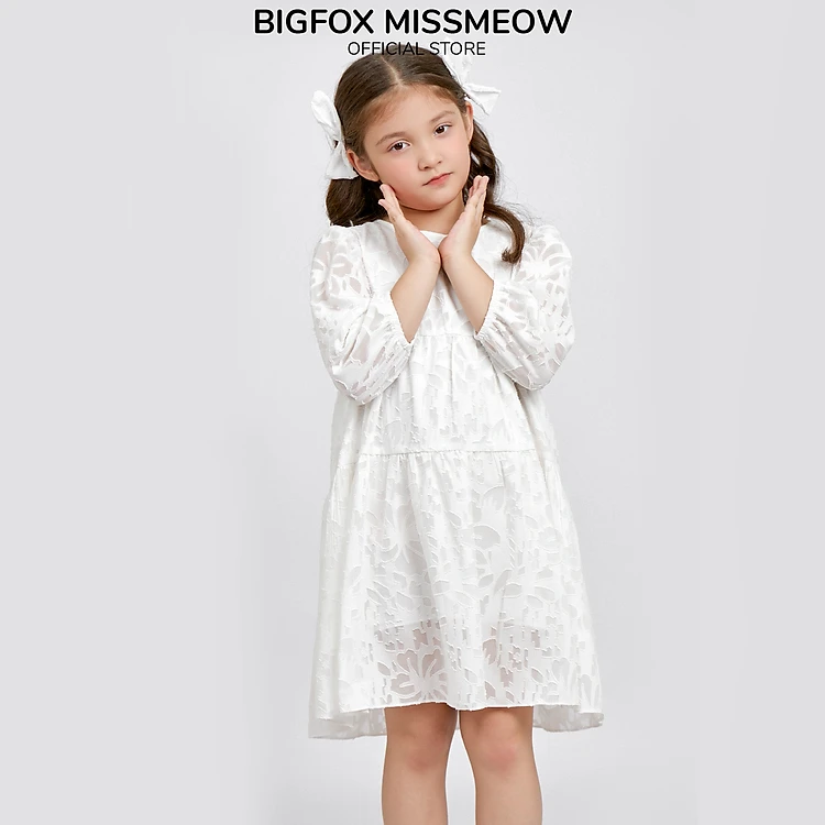 Váy trắng cho bé gái Bigfox Miss Meow size đại mặc dự tiệc, sự kiện mùa thu đông tay lỡ 2 lớp cỡ 3,7,9,11 tuổi 30kg