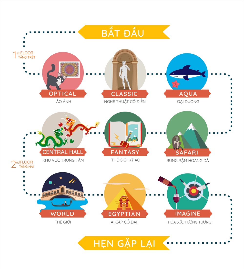Art In Paradise Danang có diện tích trên 4000M 2 , 9 khu vực chủ đề chuyên biệt với hơn 130 tác phẩm được thực hiện bởi gần 20 nghệ sĩ hàng đầu đến từ Hàn Quốc. Trong đó Tầng 1 sẽ bao gồm 5 khu vực chủ đề: Ảo ảnh - Optical, Nghệ thuật cổ điển - Classic, Đại dương - Aqua, Động vật hoang dã – Saffari, Thế giới thần tiên – Fantasy.