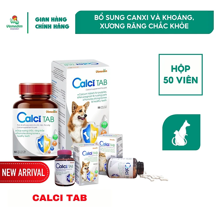 Vemedim Calci tab viên canxi cho chó và mèo con, chó và mèo mang thai giúp xương chắc, 1 hộp 50 viên