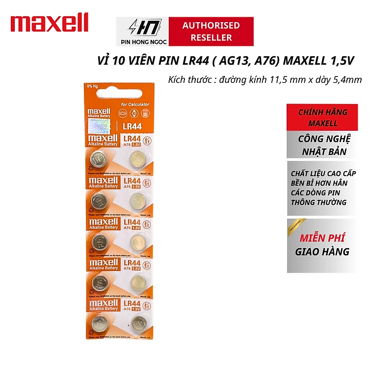 Vỉ 10 Viên pin LR44 MAXELL 1,5V