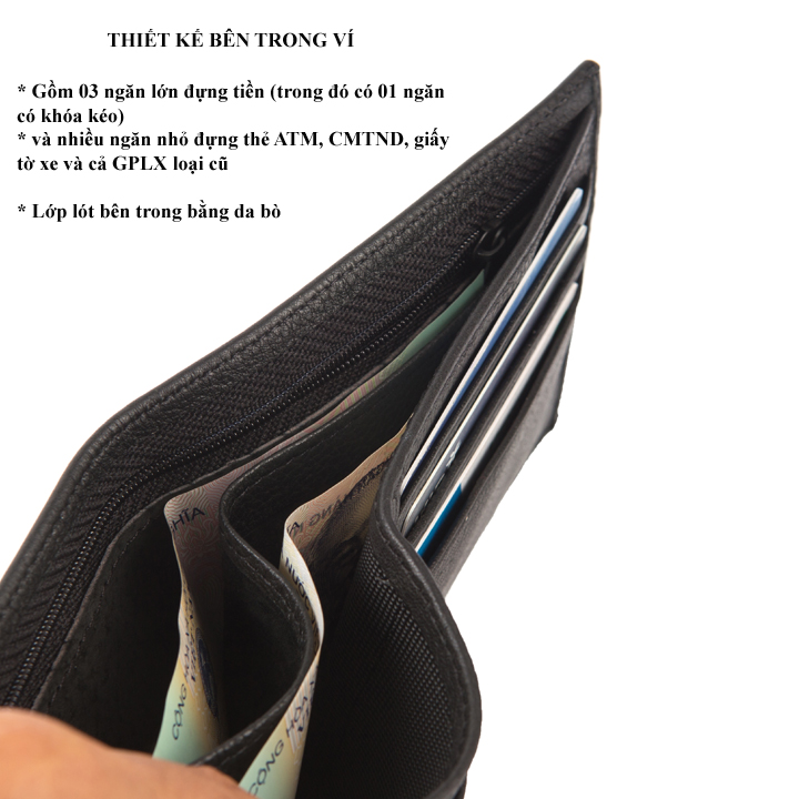 - Ví, bóp nam có thiết kế: Bên trong có 03 ngăn lớn đựng tiền (1 ngăn có khóa kéo) và nhiều Ngăn đựng thẻ ATM, Card & CMT, thẻ từ, giấy tờ xe