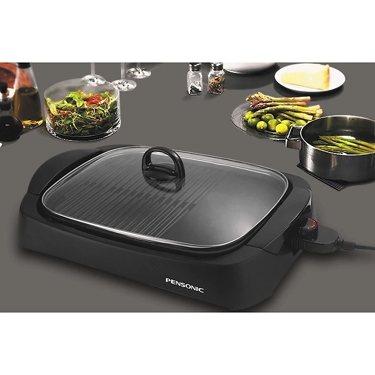 - Vỉ Nướng Điện Pensonic PTG-101G được làm từ chất liệu hợp kim phủ lớp chống dính tốt cấp với các vân nổi ở phần diện tích nướng. Thực phẩm khi nướng sẽ không bị dính, không bị ám mùi khói mà lại giữ được vị thơm ngon của món ăn. Chiếc vỉ nướng đi kèm nắp kính thủy tinh giúp dễ dàng quan sát thực phẩm đang nấu.