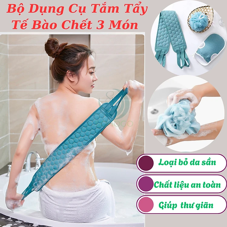 Bộ Dụng Cụ Tắm Tẩy Tế Bào Chết 3 Món – Sạch Sâu, Da Mịn Màng Set tắm tẩy da chết 3 món tiện lợi Combo găng tay – dây cọ lưng – bông tắm tạo bọt