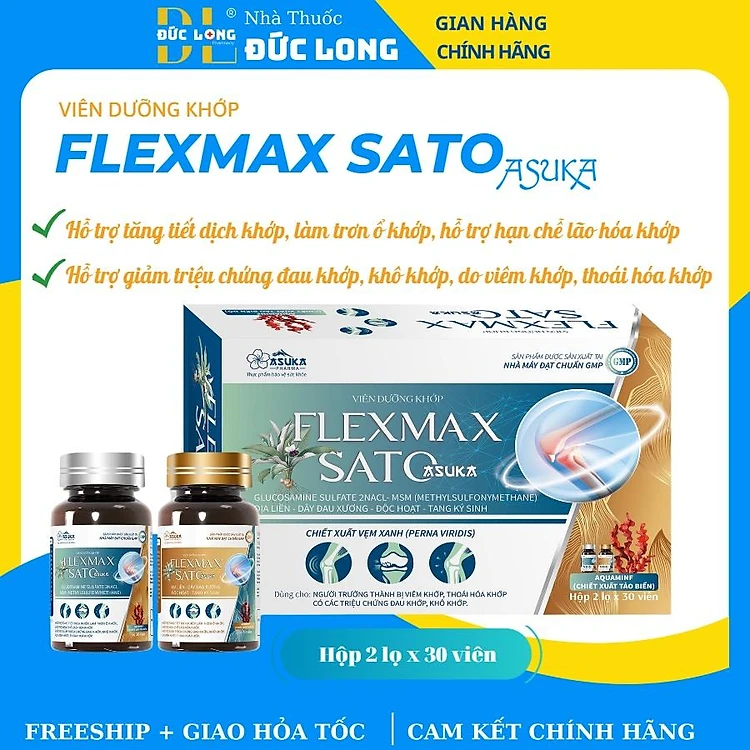 Viên dưỡng khớp Flexmax Sato – Asuka – Hỗ trợ giảm triệu chứng đau khớp – Hộp 2 lọ x 30 Viên – Đức Long