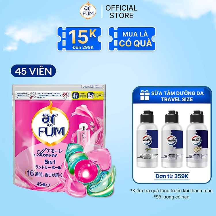 Viên giặt Quần áo arFUM 5 trong 1 MỚI thơm tinh dầu nước hoa, khử khuẩn 99% - 4 mùi hương (túi 45 viên)