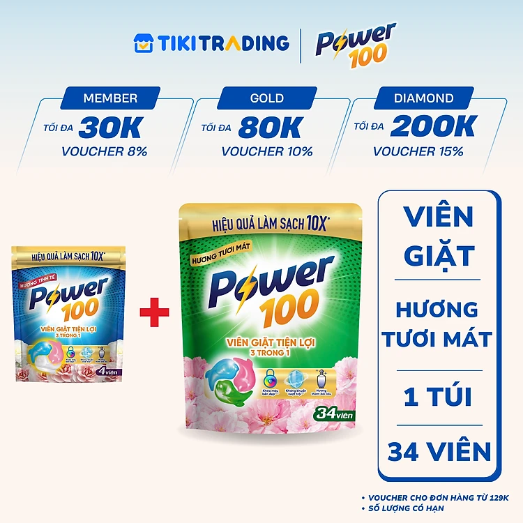 Viên Giặt Tiện Lợi Power100 3 Trong 1 Hương Tươi Mát Túi 34 Viên