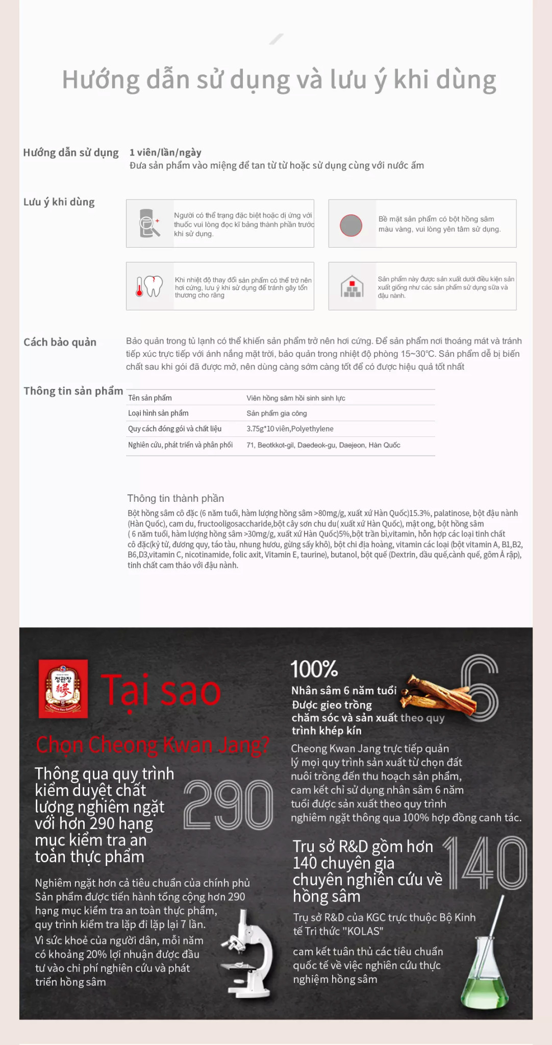 - Bột hồng sâm cô đặc (6 năm tuổi, thành phần hồng sâm 80mg/g trở lên) 15.3%, bột hồng sâm (6 năm tuổi, thành phần hồng sâm 30mg/g trở lên) 5%, palatinose, bột đậu nành, glycerin, fructooligosaccharides, bột dầu ngô, mật ong, bột chiết xuất từ hạ bì, nước chiết xuất từ hạ bì, dextrin, cellulose tinh thể, hỗn hợp vitamin (vitamin A, vitamin B1, hydrochloride, vitamin B2, vitamin B6 hydrochloride, vitamin C, vitamin D3, nicotinamide, axit folic, vitamin E, taurine, xylitol, bột hương vị quế (ductrin, dầu quế, chiết xuất quế, gum arabic), nước chiết xuất cam thảo.
