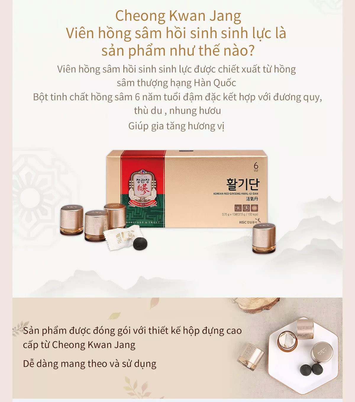 - Viên hồng sâm Hwal Gi Dan được đựng trong hộp dạng ống trụ tròn, thiết kế dạng viên tiện lợi khi sử dụng.