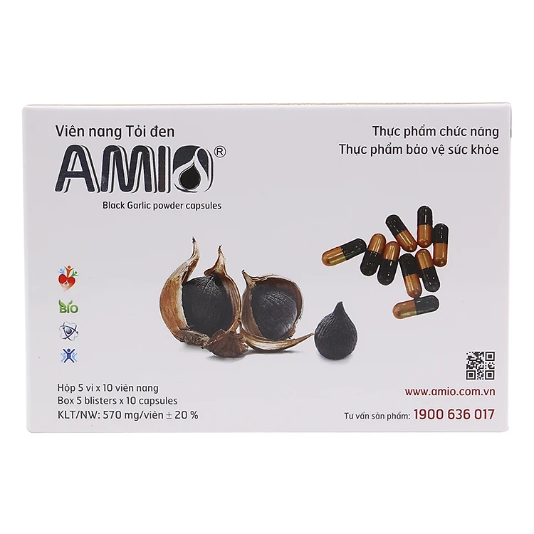 - Viên Nang Tỏi Đen Amio AVN050 (Hộp 5 Vỉ x 10 Viên) giúp tăng cường khả năng miễn dịch, nâng cao thể trạng, bồi bổ cơ thể, kích thích tiêu hóa, giúp ăn ngủ tốt đặc biệt ở người cao tuổi và góp phần tích cực trong việc phòng chống bệnh tật. Đồng thời, tỏi đen còn giúp giảm mỡ máu, tốt cho người bị tim mạch.