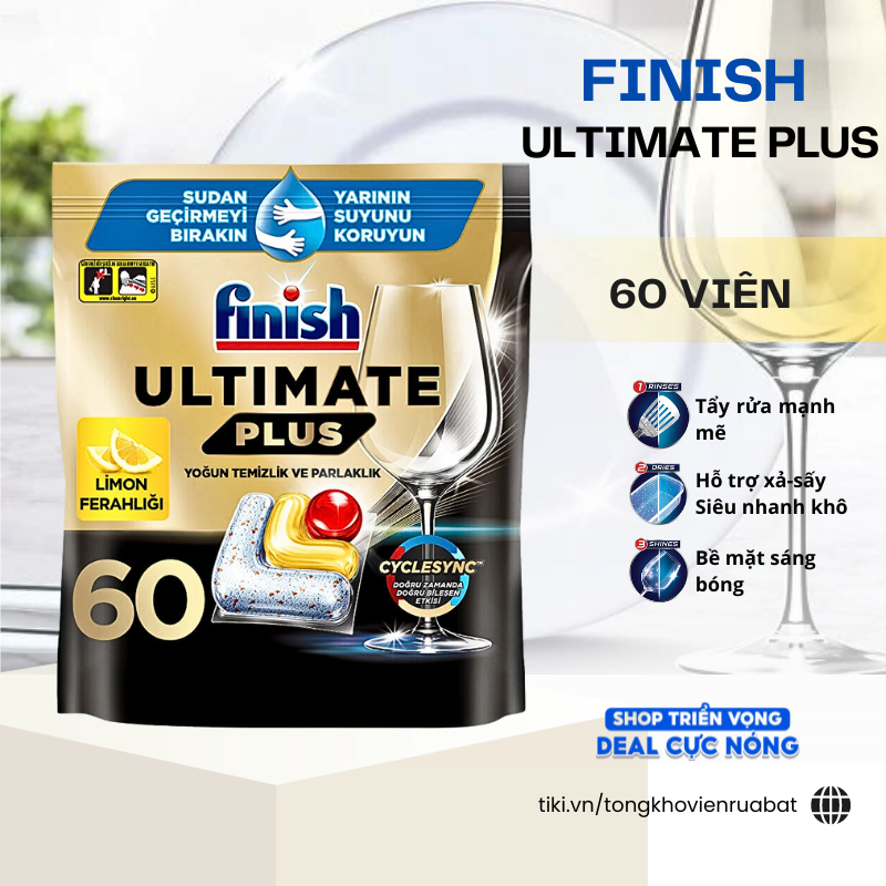 Túi viên rửa bát Finish Quantum ULTIMATE PLUS 60 viên là dòng cao cấp và đắt tiền nhất của Finish vì tổng hợp cả 3 thành phần:
