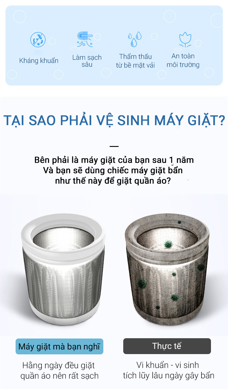 Đối với các máy giặt mới, có thể các vết bẩn như cặn canxi, vết bám bẩn nâu đen sẽ chưa xuất hiện cả trong và ngoài lồng máy giặt, thì khi sử dụng viên vệ sinh của chúng tôi nước sẽ chuyển màu không nhiều trong và sau chu trình tẩy rửa, vì lồng máy giặt chưa bám cặn nhiều mà 1 số ít trong đó bị hòa tan trong nước luôn, nhưng chúng ta đã và đang chia tay với hàng loạt vi khuẩn có hại bám trên thành lồng máy giặt. cũng như trong đừng ống thải máy giặt.( Vì mình thấy 1 số bạn khi xả nước không " đen thui " như clip nên quánh 1* thiệt là buồn quá đi mà :( , máy giặt gia đình chớ có phải nước cống đâu mà mong muốn nó đen, nước càng sạch thì máy càng tốt chứ ạ ).