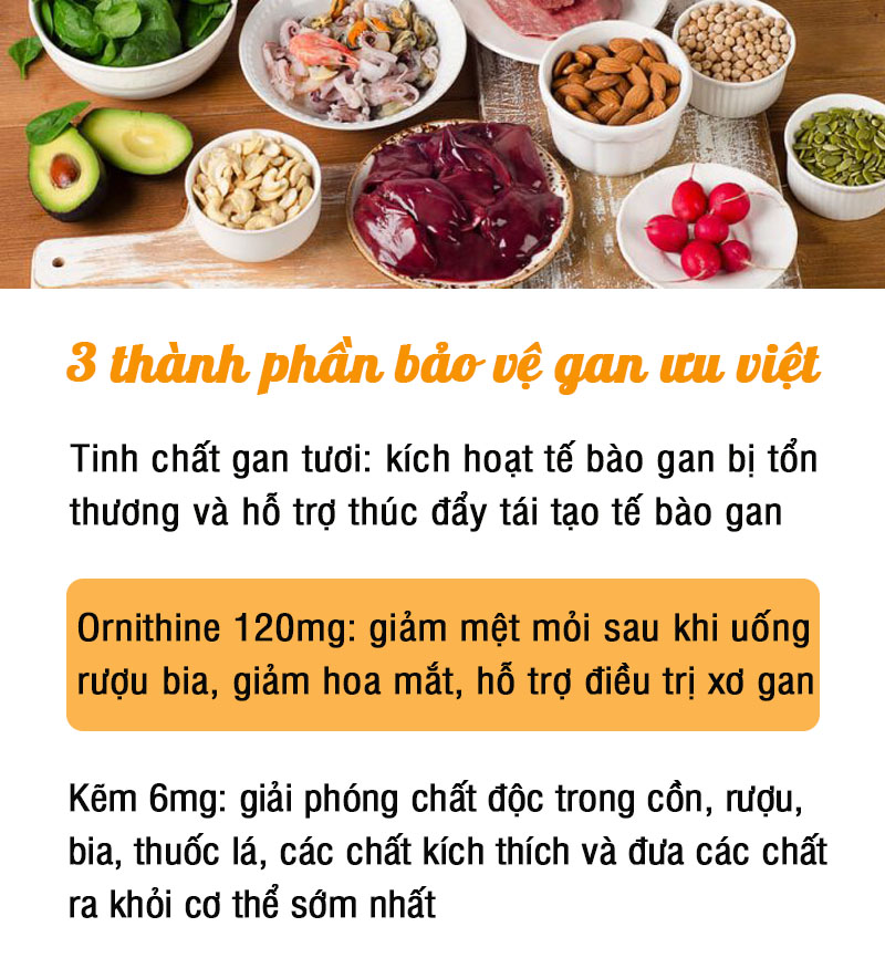 - Thành phần Ornithine và Kẽm hỗ trợ đẩy nhanh quá trình phân giải rượu.