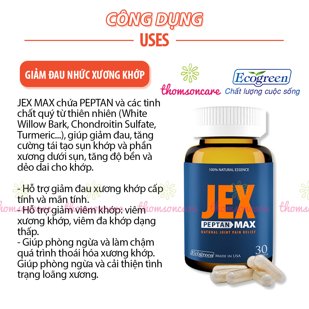 JEX MAX chứa PEPTAN và các tinh chất quý từ thiên nhiên, giúp giảm đau, tăng cường tái tạo sụn khớp và phần xương dưới sụn, tăng độ bền và dẻo dai cho khớp.