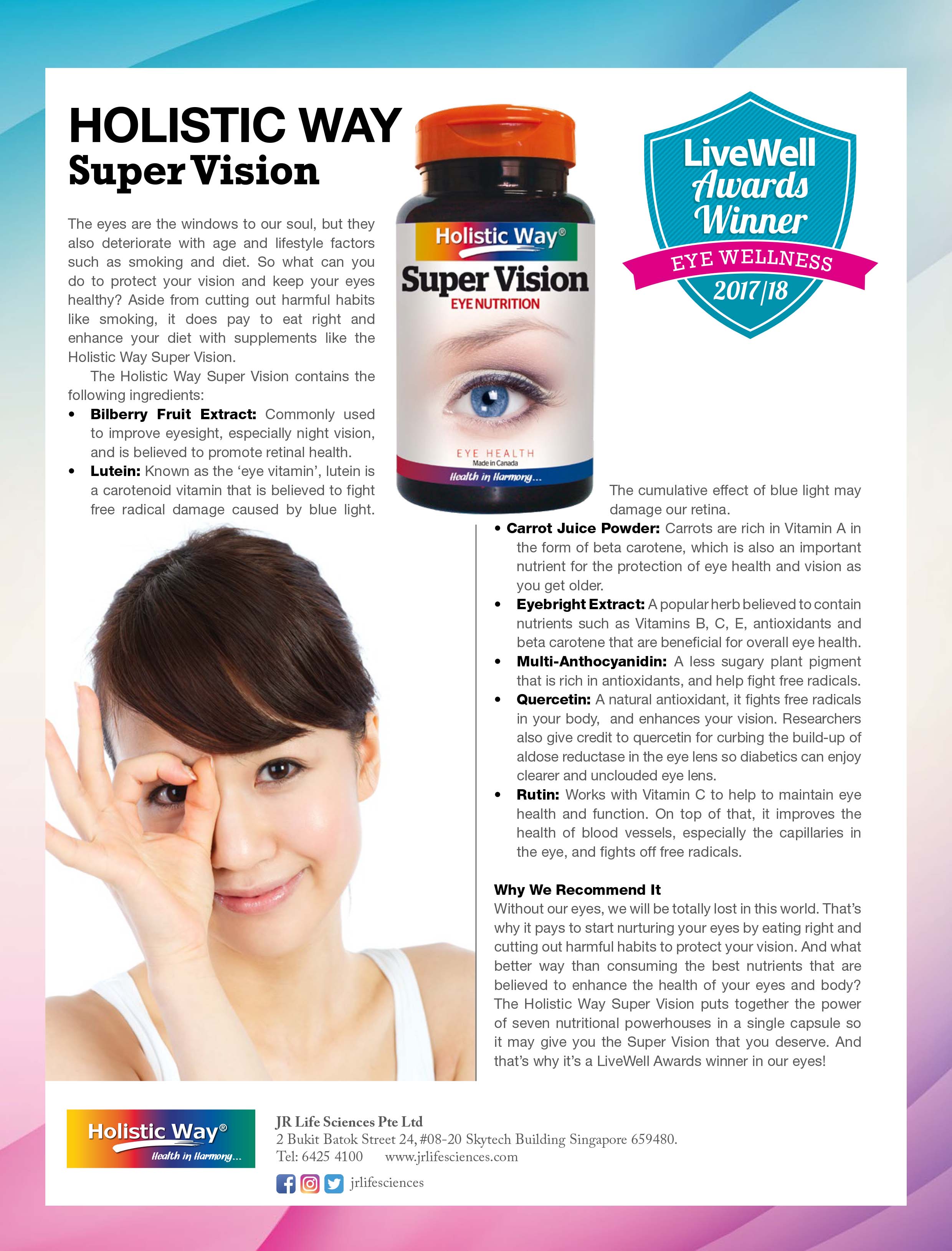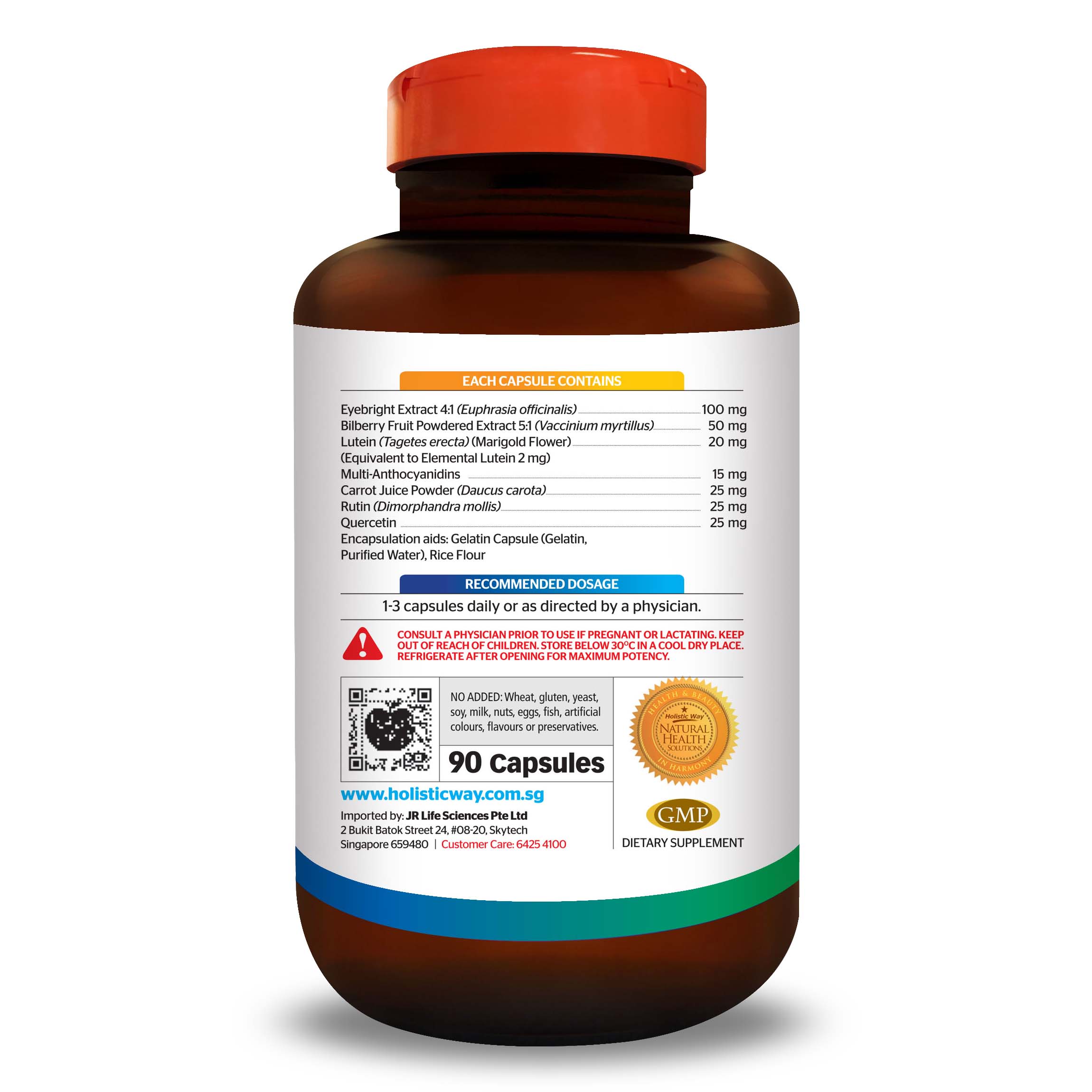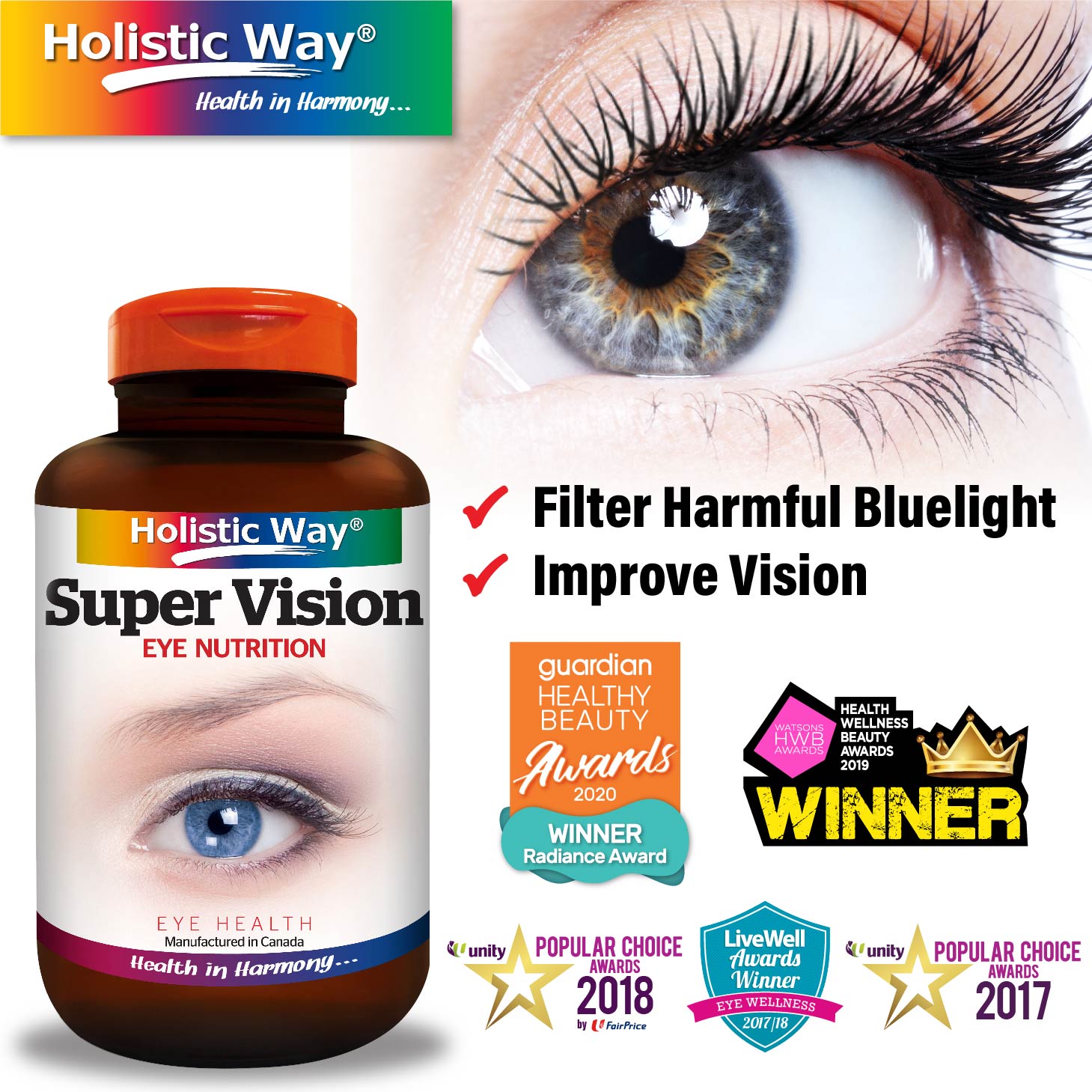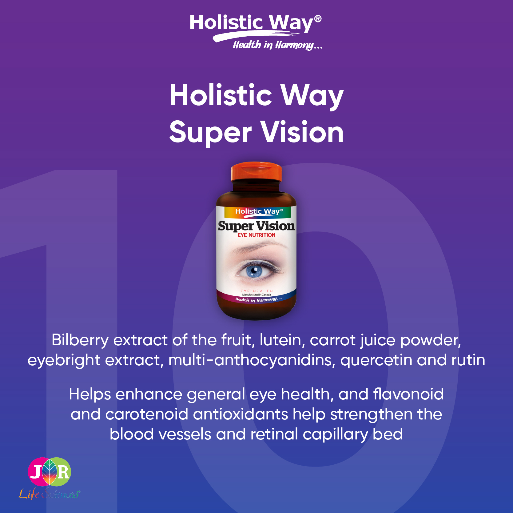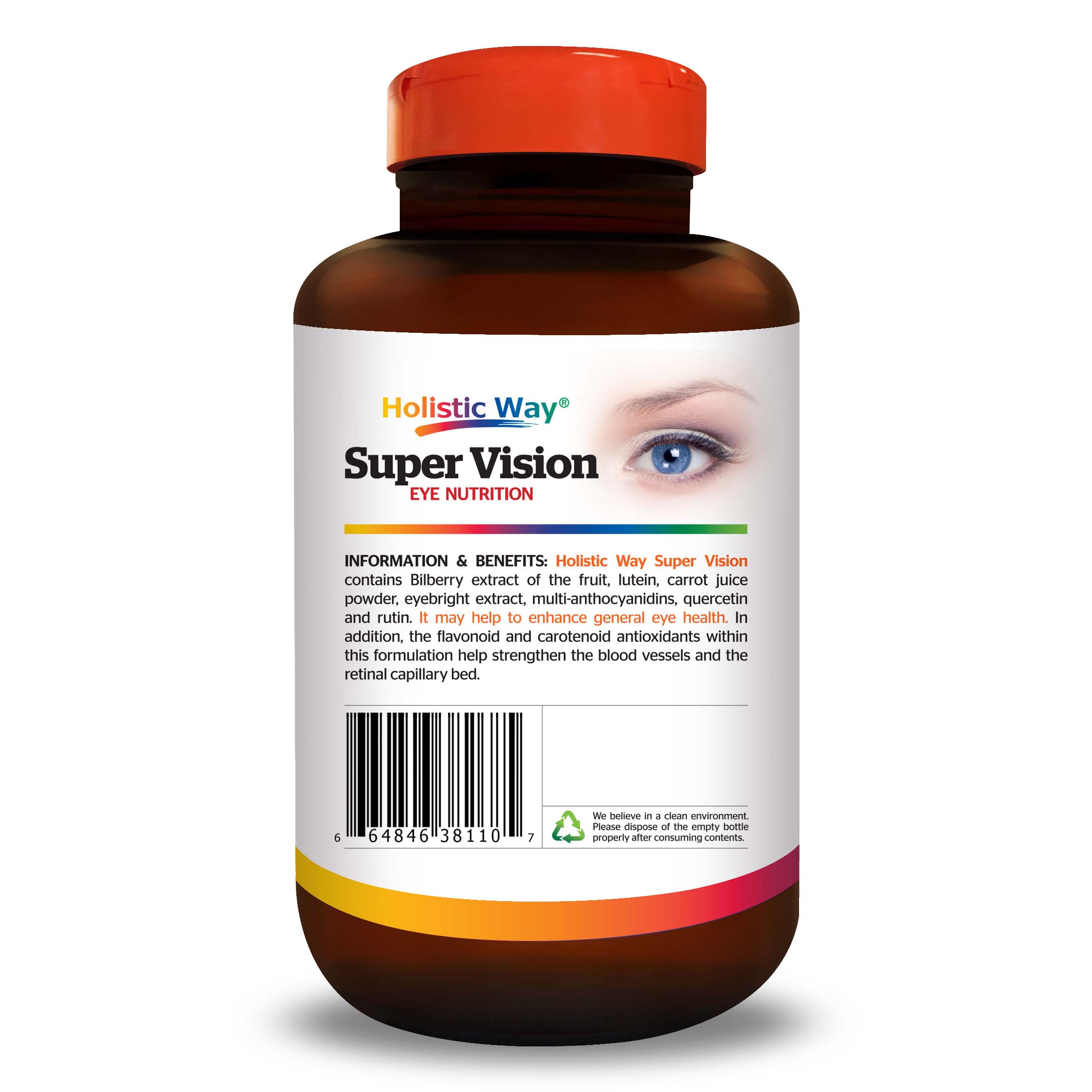 Holistic Way Super Vision chứa chiết xuất Bilberry của trái cây, lutein, bột nước ép cà rốt, chiết xuất cây bọng mắt, multi-anthocyanidins, quercetin và rutin.