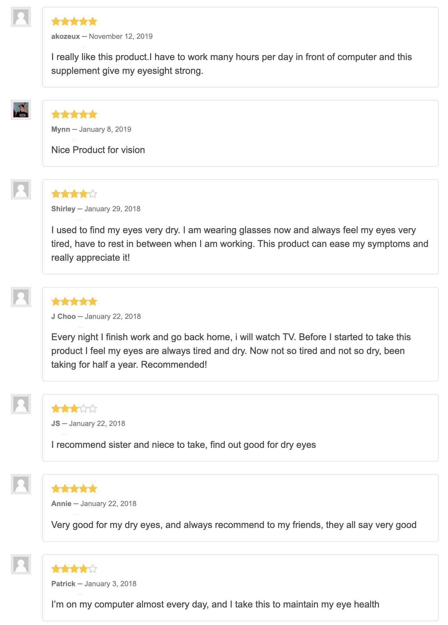 Sản phẩm có thể giúp tăng cường thị lực của mắt nói chung. Ngoài ra, chất chống oxy hóa flavonoid và carotenoid trong công thức này giúp tăng cường các mạch máu và mao mạch võng mạc.