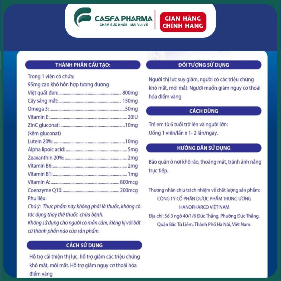 Mỗi viên uống chứa một lượng lớn các thành phần quý giá như Việt quất đen, cây sáng mắt, Omega 3, Lutein, Zeaxanthin và nhiều loại vitamin và khoáng chất khác. Những thành phần này đã được chứng minh là có khả năng giúp bảo vệ mắt khỏi các tác động có hại từ môi trường và tăng cường thị lực.