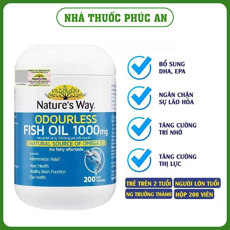 Viên uống dầu cá Omega 3 Nature’s Way Odourless Fish Oil 1000mg 80 - 200 viên hỗ trợ tim mạch, bổ não, tăng cường thị lực
