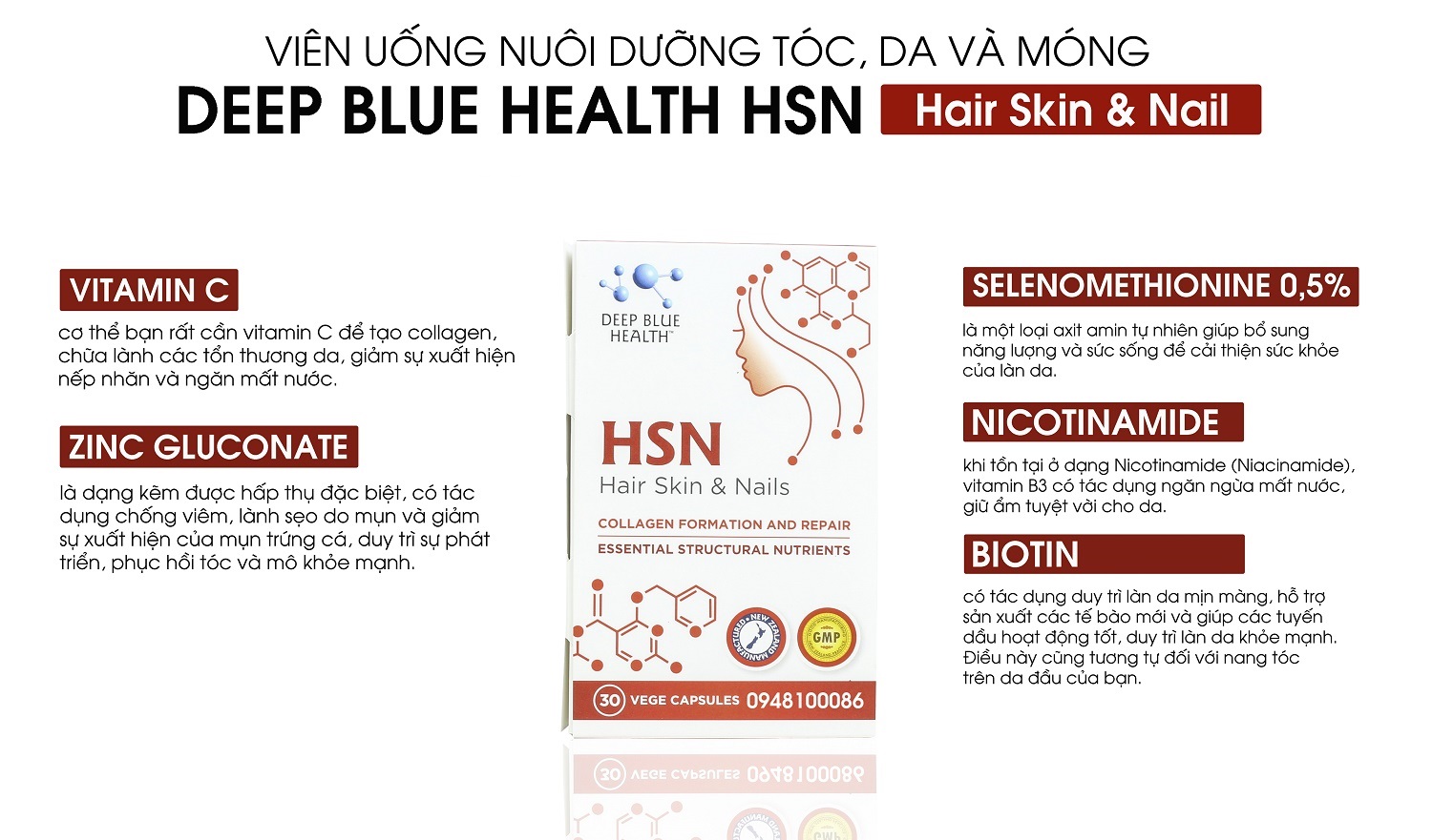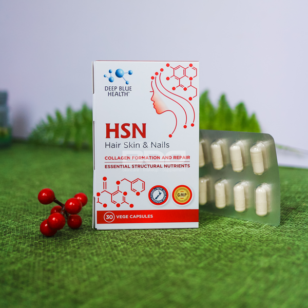 Viên uống dưỡng da, tóc và móng Deep Blue Health HSN Hair Skin & Nails được đặc chế để cung cấp các dưỡng chất cấu trúc thiết yếu cho sự hình thành và hỗ trợ sửa chữa collagen. Công thức độc đáo này là hoàn hảo cho bất cứ ai có làn da khô, thô ráp hoặc lão hóa sớm, móng giòn hoặc yếu, tóc xỉn màu hoặc vết thương khó lành.