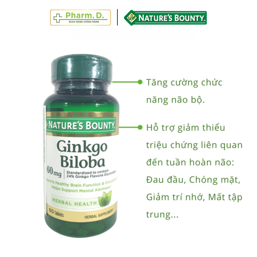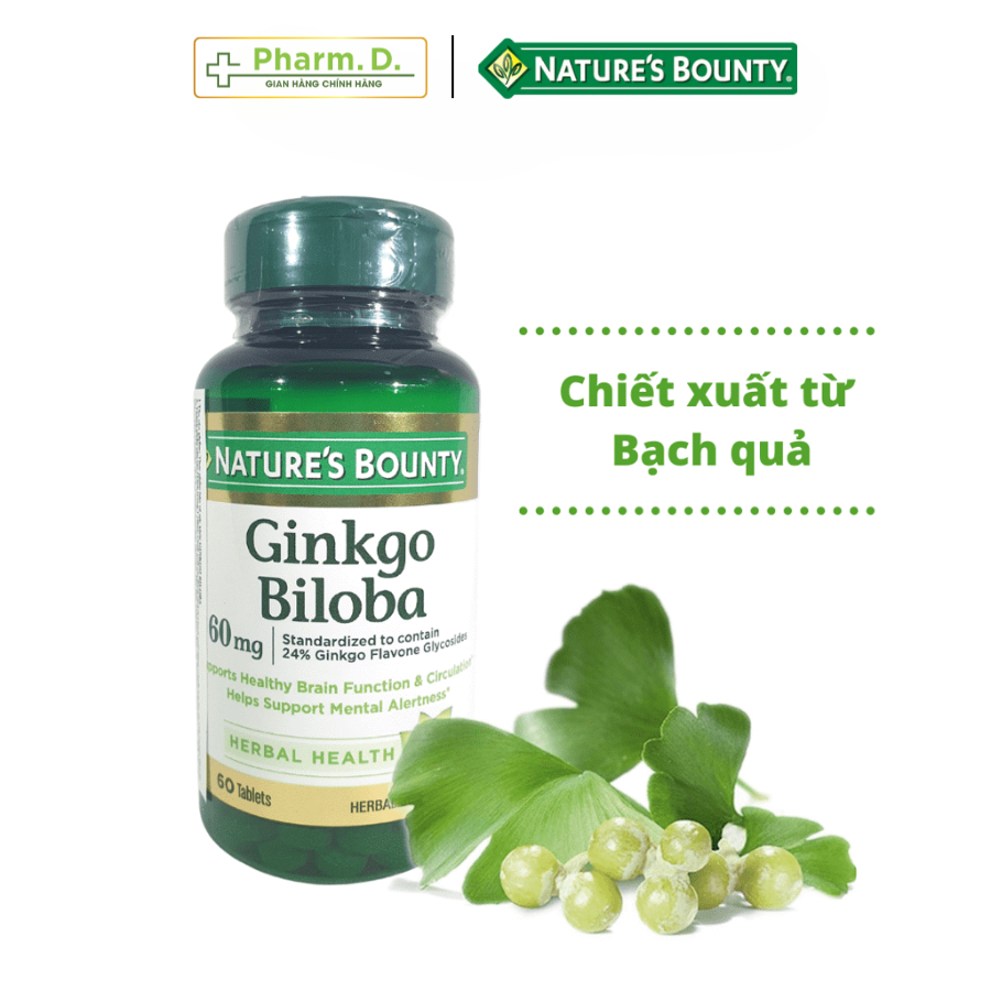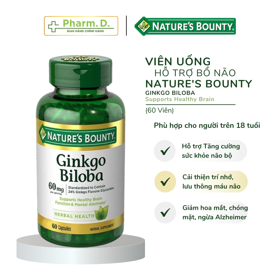 Viên Uống NATURE'S BOUNTY Ginkgo Biloba Supports Healthy Brain Hỗ Trợ Bổ Não, Cải Thiện Trí Nhớ (60 Viên) là sản phẩm nổi tiếng đến từ thương hiệu Nature's Bounty được sản xuất tại Mỹ. Với thành phần chiết xuất tự nhiên từ Lá Bạch Quả - Ginkgo có tác dụng bồi bổ cho trí não, tăng khả năng lưu thông máu lên não được tốt hơn. Ngoài ra, Ginkgo Biloba 60mg còn bảo vệ các tế bào ở hệ thần kinh trung ương, tăng tính chịu đựng của mô não khi thiếu oxy và chống oxy hóa của các gốc tự do có hại.