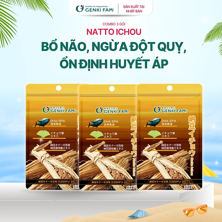 Combo 3 Gói Viên Uống Natto Ichou, Phòng Ngừa Đột Quỵ, Bổ Não, Nattokinase 3000 FU Genki Fami Nhật Bản Túi 30 Viên