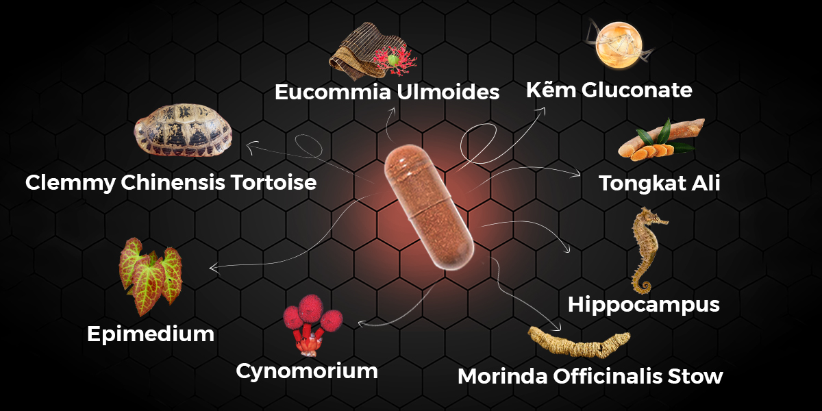 Thành phần: Eurycoma longifolia; Hippocampus; Morinda oficinnalis stow; Epimedium; Cynomorium; Clemmy chinensis tortoise; Eucommia ulmoides; Horse Bone Extract; Zn gluconate; Gelatin; Talc; Magie stearat; Gelatin.