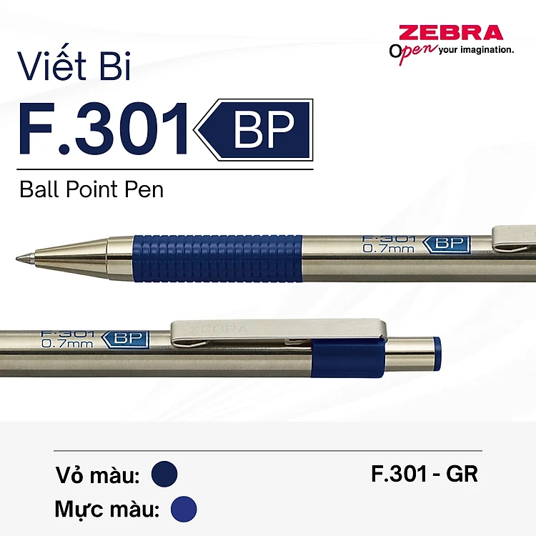 Bút Bi F.301 0.7mm Zebra Pen Mực Xanh - Vỏ Đỏ Xanh Lá Xanh Dương Đen 12.6g [Chính Hãng]