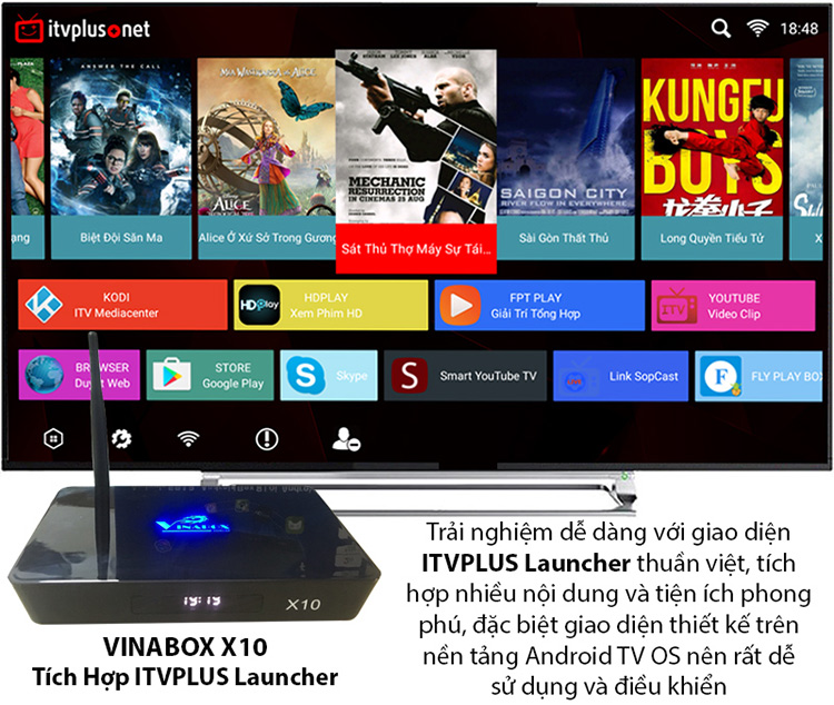 Bên cạnh đó, Vinabox X10-Android TV Box còn tích hợp giao diện ITVPlus Launcher thuần Việt, tùy biến, tối ưu hóa cho ti vi nên việc sử dụng vô cùng đơn giản. Phù hợp với tất cả mọi người. Và tích hợp công nghệ Miracast, Airplay giúp truyền hình ảnh không dây từ Smartphone đến tivi một cách dễ dàng, đơn giản.
