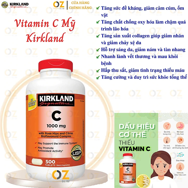 Vitamin C Kirkland Signature Mỹ tăng sức đề kháng, sáng da, mờ thâm, làm chậm quá trình lão hóa, nhanh lành vết thương (bệnh) - OZ Slim Store