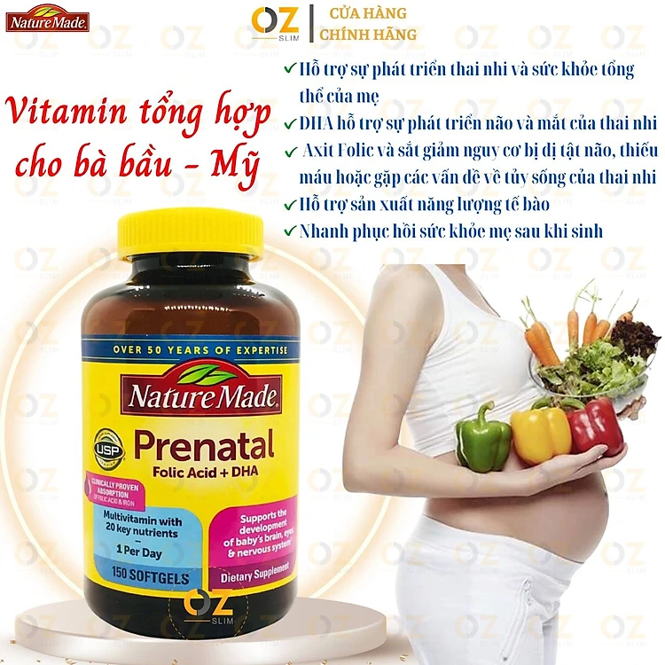 Vitamin tổng hợp cho bà bầu Prenatal Folic Acid+ DHA Nature Made giúp mẹ khỏe, thai nhi phát triển tốt (Mỹ) - OZ Slim Store