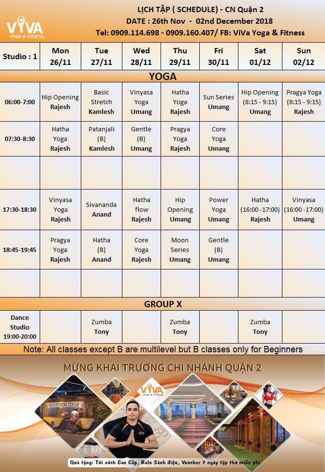 Với các chương trình tập luyện được thiết kế một cách khoa học: Huấn luyện cá nhân, Yoga & thể dục nhóm cho nam và nữ, chắc chắn bạn sẽ tìm thấy chương trình tập luyện phù hợp nhất với mục tiêu và nhu cầu của mình. Tại Viva Yoga & Fitness, việc tập luyện của bạn sẽ không còn nhàm chán với sự hướng dẫn tận tình từ đội ngũ Huấn Luyện Viên được đào tạo một cách bài bản.