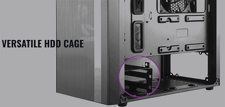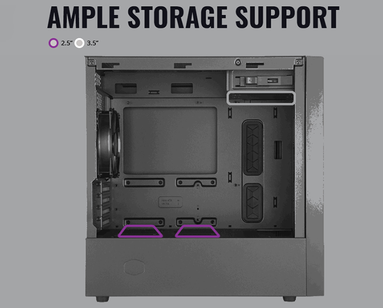 Master NR400 hỗ trợ gắn tối đa 4 x 2.5″ và 3 x 3.5″ ổ đĩa bằng hệ thống gắn không cần dùng tuốc vít. Các ổ lưu trữ có thể gắn phía trên che nguồn, phía sau khay Mainboard, và bên trong các khay chứa HDD. Ngoài ra, thiết bị còn tích hợp cổng đơn 4-chấu chuẩn 3.5mm giúp bạn cắm Headset mà không cần thông qua một dây chia nào nữa.