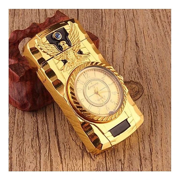 Vỏ Hột Quẹt Bật Lửa Gas Khò Kiêm Đồng Hồ Đèn Led 7 Màu Hình Nổi Độc Lạ Màu Vàng - Dùng Gas Cao Cấp