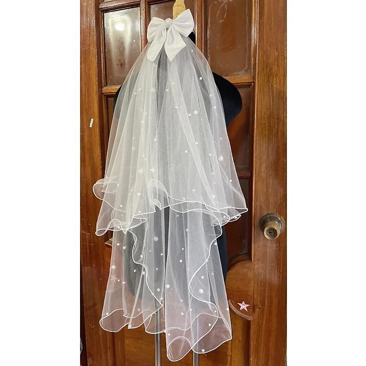 Voan cài tóc cô dâu 2022 đính nơ viền đính hạt trai hai lớp dài 90 cm Giangpkc