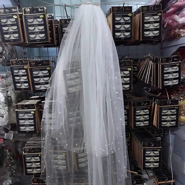 Voan cài tóc cô dâu trắng 3 tầng đính hạt trai dài lớn nhất 1,4m