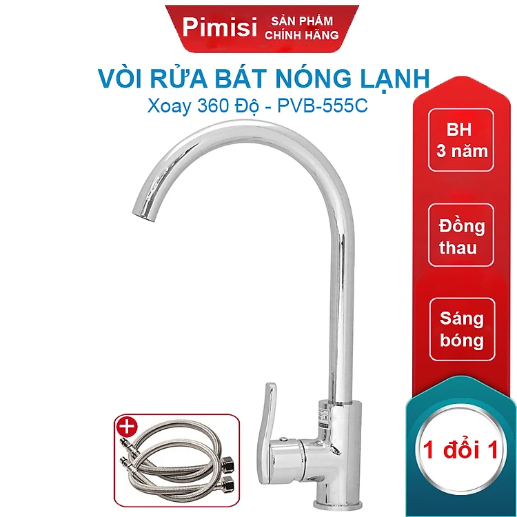Vòi rửa bát nóng lạnh Pimisi đồng thau mạ xi Cr/Ni sáng bóng kiểu tròn điều chỉnh nhiệt độ bằng tay gật gù - kèm 2 sợi dây cấp nước dùng cho chậu rửa bát 1-2-3 hố trong nhà bếp - vòi nước rửa chén gắn chậu âm dương bàn đá quay 360 độ tăng áp | Chính hãng
