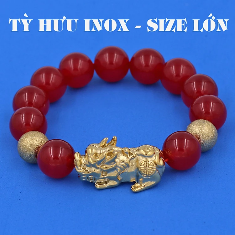 Vòng chuỗi đeo tay đá thạch anh đỏ 14 ly ( size lớn ) charm tỳ hưu và bi inox vàng, vòng tay chuỗi hạt