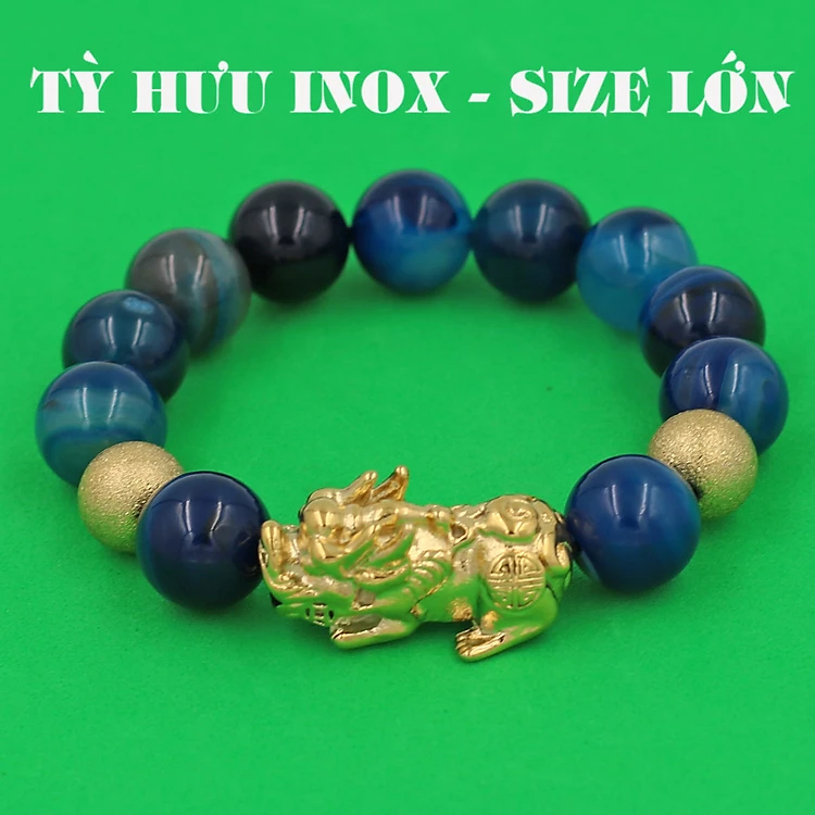 Vòng chuỗi đeo tay mã não xanh biển sọc 14 ly ( size lớn ) charm tỳ hưu và bi inox vàng, vòng tay chuỗi hạt