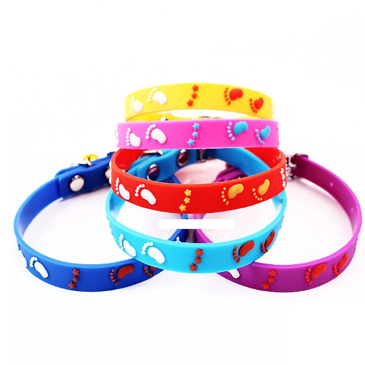 Chiếc vòng cổ nhỏ xinh được làm từ cao su với nhiều màu sắc bắt mắt và được trang trí thêm những dấu chân nhỏ sẽ là sự lựa chọn thích hợp cho những bé cún dưới 5KG