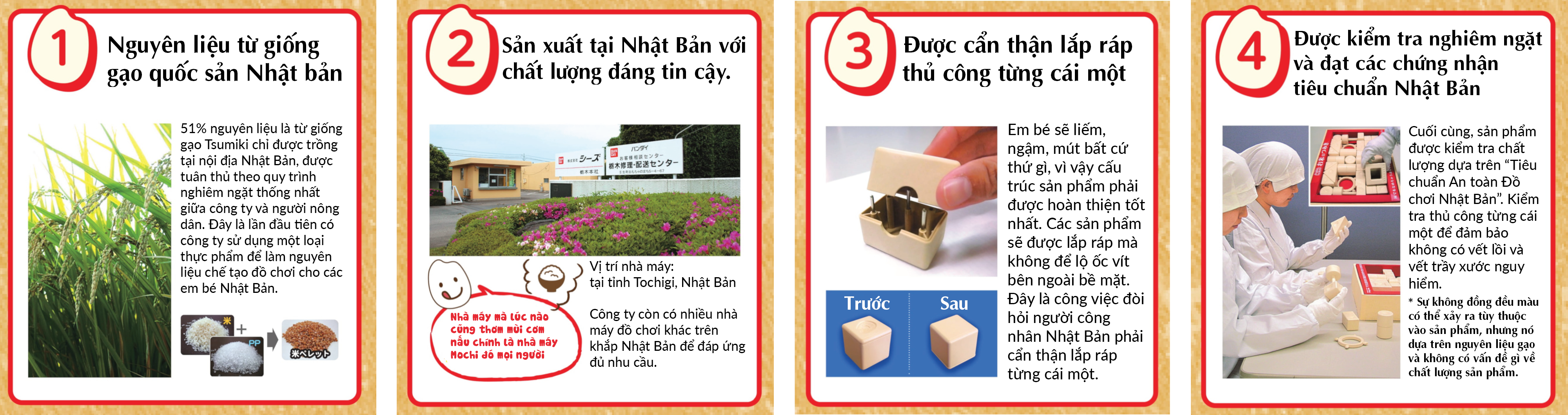 Các bậc phụ huynh ngày nay mong đợi nhiều hơn từ đồ chơi của con mình; Khi mà tiêu chuẩn đánh giá sản phẩm chú trọng đến mức độ hóa chất không an toàn và nguyên liệu không thân thiện với môi trường trong thành phần. Dòng sản phẩm đồ chơi Mochi được phát triển bằng công nghệ tiên tiến Nhật Bản kết hợp giữa gạo và chất dẻo, sử dụng 51% thành phần làm từ gạo trong cấu trúc, đảm bảo độ bền, an toàn để bé học và chơi. Dòng sản phẩm Mochi không chứa hóa chất độc hại, sơn hay chất kết dính, mang đến cho bạn sự an tâm khi món đồ chơi đầu tiên bé ngậm vào miệng đảm bảo 100% thân thiện với môi trường và thật sự vui thích.