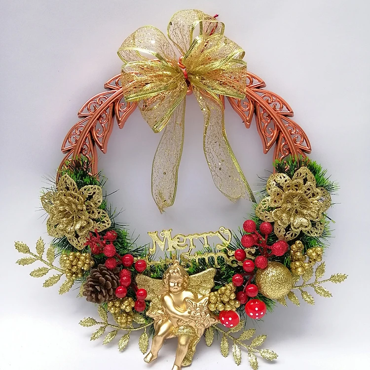 Chi tiết trang trí gồm: lá thông xanh, thiên thần cầm đàn màu vàng, 2 bông trạng nguyên, quả thông, nấm đỏ, chùm diệu màu vàng,quả cherry, nấm, nơ. Nơ kim tuyến lấp lánh, có thể tùy uốn điều chỉnh.