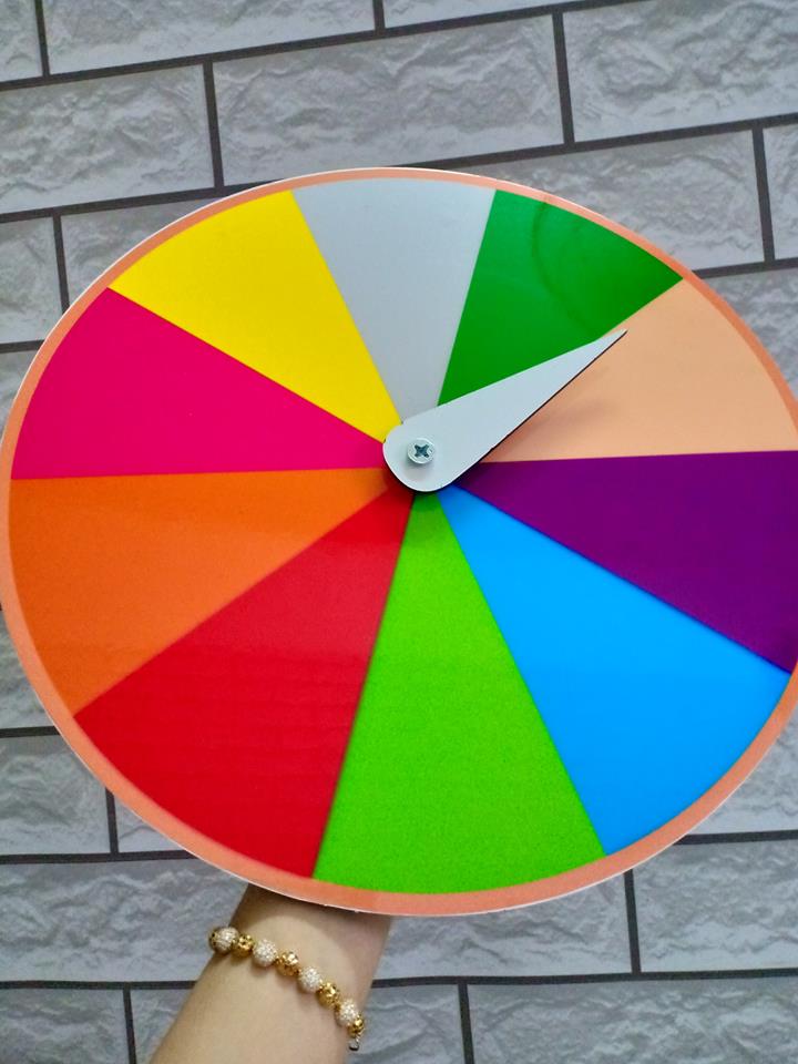 - Vòng xoay nhiều màu, đường kính 30cm, chất liệu alu dán decal bóng, có thể viết bút lông và tẩy xóa dễ dàng.