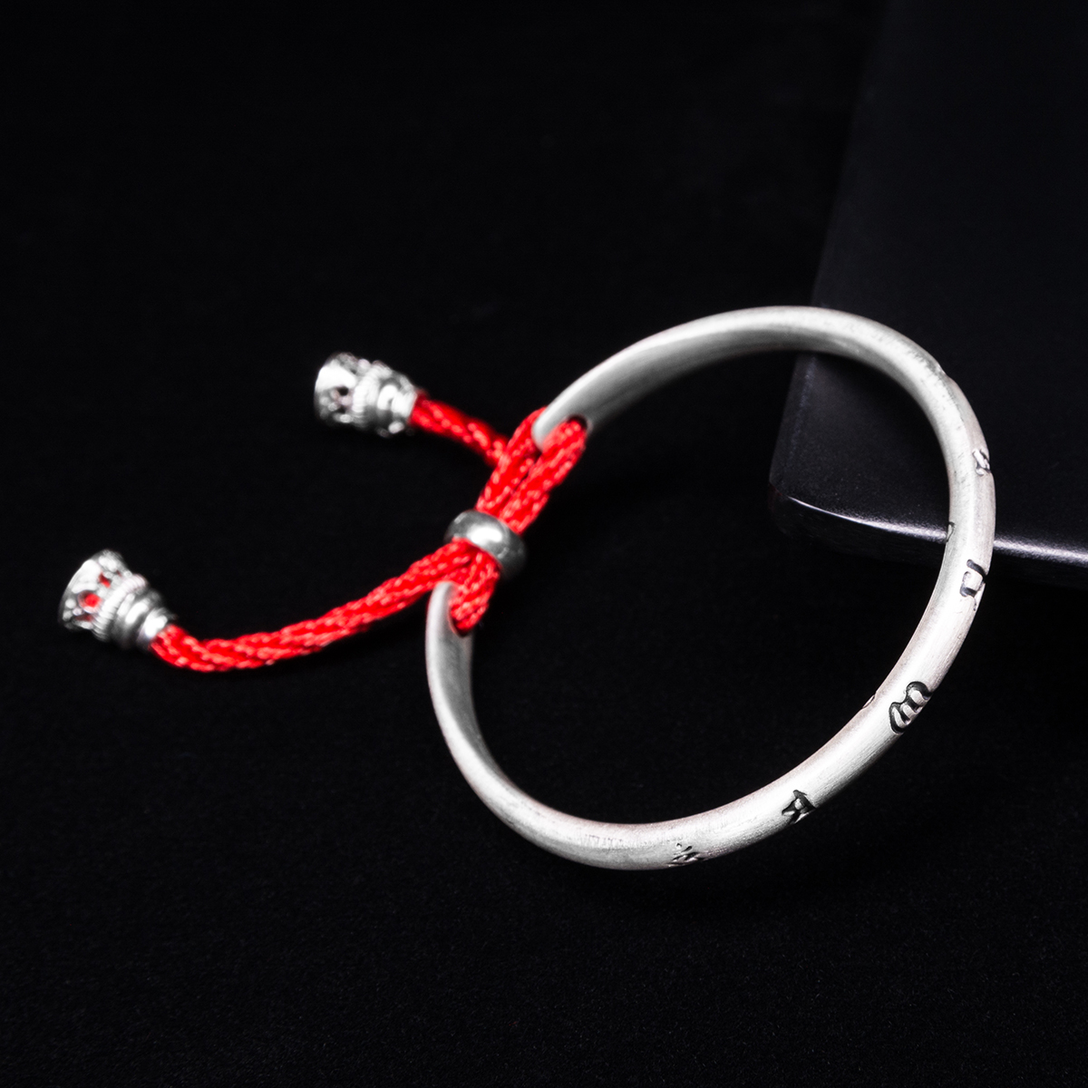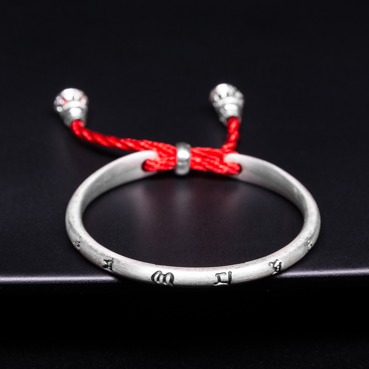 Chất liệu: bạc nõn S999 (>= 99.99% bạc nguyên chất) và chỉ tơ đỏ.