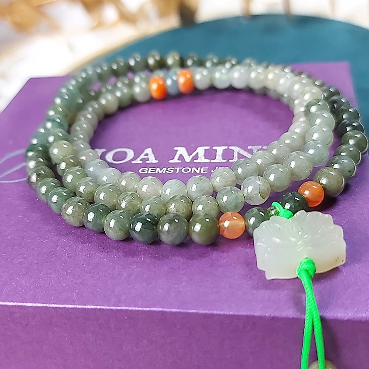 Vòng tay chuỗi 108 hạt Cẩm Thạch dầu size 5.2 li phối theo dải màu radiant cùng mặt dây hoa sen chất ngọc hòa điền tinh xảo, phong thủy bình an