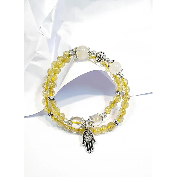 Vòng tay mệnh Kim, thủy đá thạch anh tóc vàng, Thạch anh trắng và charm Hamsa