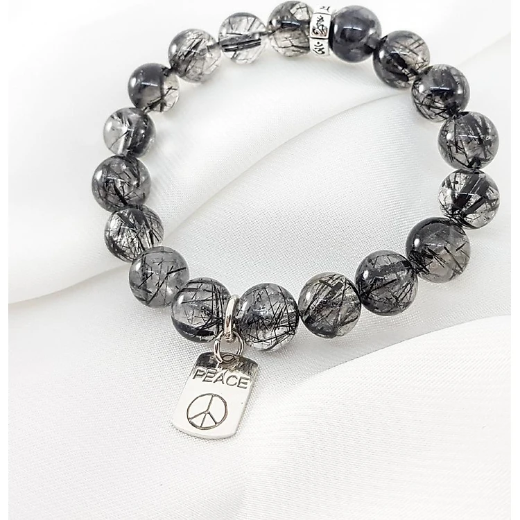 Vòng tay nam mệnh kim, thủy đá thạch anh tóc đen mix charm PEACE