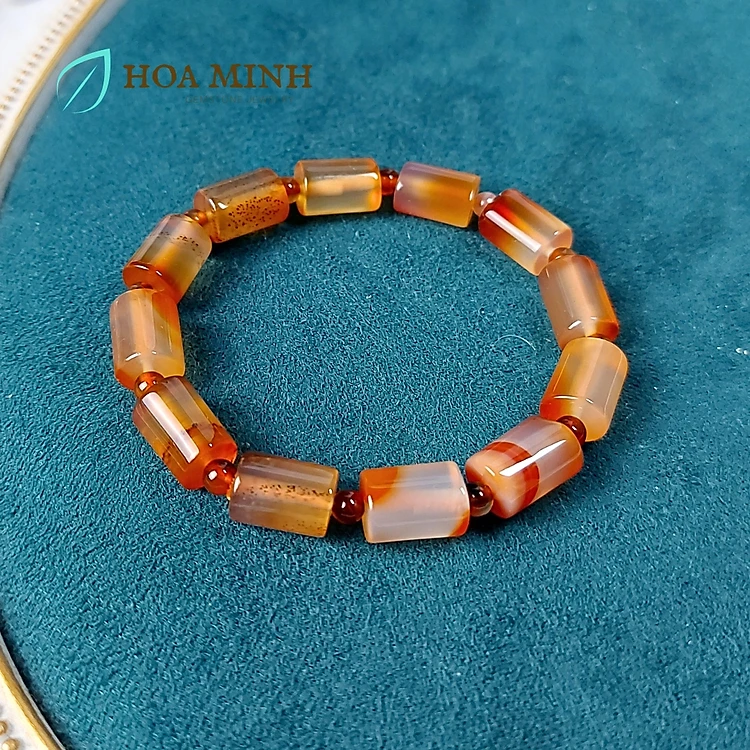 Vòng tay phong thủy đá Mã Não vàng cam phớt dạng lu thống 8 x 12mm xen kẽ viên tròn